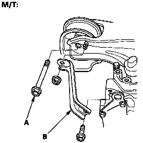 21. Remove the front engine mount bracket mounting bolts (A), and loosen the mount bolt (B).