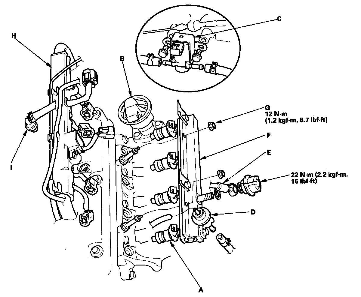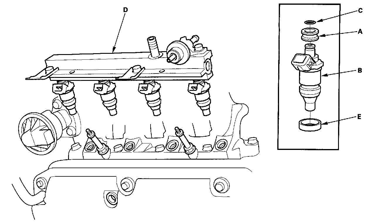 4. Disconnect the fuel hose (E) from the fuel rail (F).