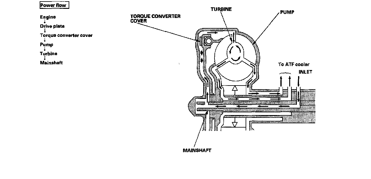 Lock-up SystemIn D4 position (3rd and 4th), and D position (3rd), pressurized fluid is drained from the back of the torque converter through a fluid passage, causing the lock-up piston to be held against the torque converter cover. As this takes place, the mainshaft Rotates at the same speed as the engine crankshaft. Together with hydraulic control, the PCM optimizes the timing of the lock-up mechanism. When the torque converter clutch solenoid valve (lock-up control solenoid valve) activates, modulator pressure changes to switch lock-up ON and OFF. The lock-up control valve and the lock-up timing valve control the range of lock-up according to A/T clutch pressure control solenoid valves A and B. The torque converter clutch solenoid valve is mounted on the torque converter housing, and A/T clutch pressure control solenoid valves A and B are mounted on the transmission housing. They are controlled by the PCM.