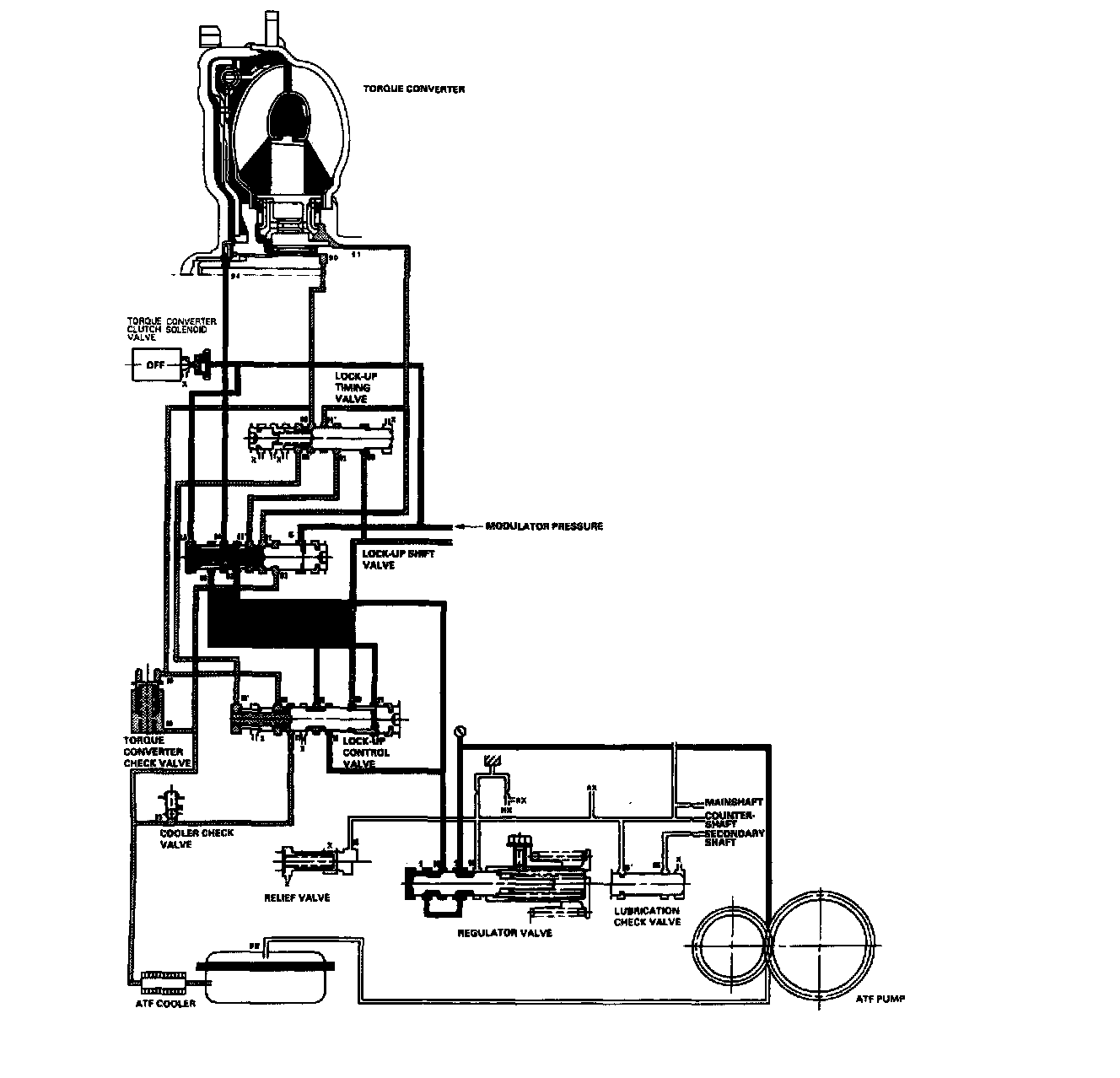 The torque converter clutch solenoid valve is turned OFF by the PCM. The lock-up shift valve receives LC pressure (LA) on the left side, and modulator pressure (6) on the right side. The lock-up shift valve is in the right side to uncover the port leading torque converter pressure (92) to the left side of the torque converter. Torque converter pressure (92) becomes torque converter pressure (94), and enters into the left side of the torque converter (to disengage the lock-up clutch). The lock-up clutch is OFF.