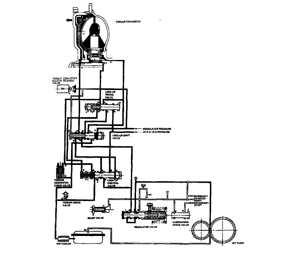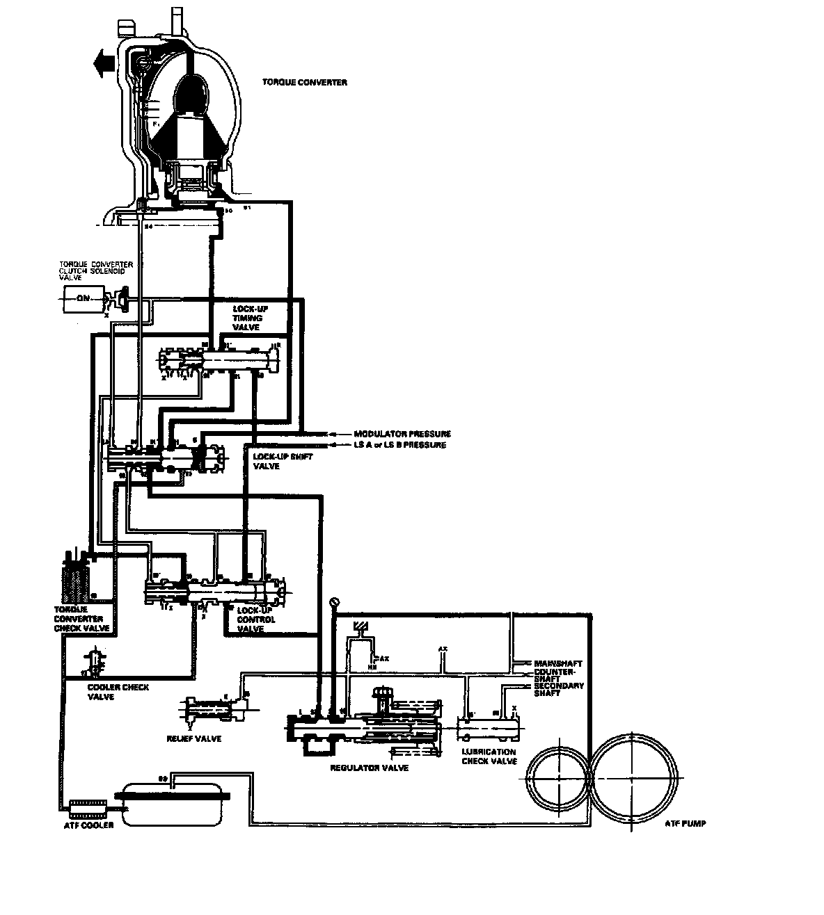 As the speed of the vehicle reaches the prescribed value, the torque converter clutch solenoid valve is turned ON by the PCM to release LC pressure (LA) in the left side of the lock-up shift valve. The lock-up shift valve is moved to the left side to switch the port leading torque converter pressure to the left side and right side of the torque converter. Torque converter pressure (92) flows to the right side of the torque converter to engage the lock-up clutch. The PCM also controls A/T clutch pressure control solenoid valves A and B. and LS A or LS B pressure is applied to the lock-up control valve and the lock-up timing valve. The position of the lock-up control valve depends on torque converter pressure and LS A or LS B pressure. When LS A or LS B pressure (58) is lower, torque converter pressure (91) from the lock-up timing valve is lower. The lock-up clutch is engaged partially. LS A or LS B (58) increases, and the lock-up timing valve is moved to the left side to uncover the port leading torque converter pressure to high. The lock-up clutch is then engaged securely. Under this condition, the lock-up clutch is engaged by pressure from the right side of the torque converter; this condition is partial lock-up.
