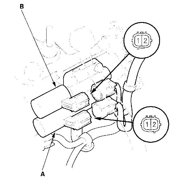 A/T Clutch Pressure Control Solenoid Valves A and B Test1. Disconnect the A/T clutch pressure control solenoid valves A and B 2P connectors.