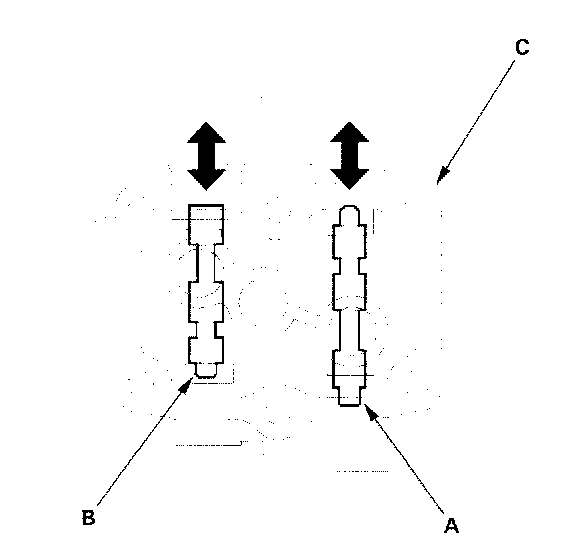 Note: You can see the valve movement through the fluid passage in the mounting surface of the A/T clutch pressure control solenoid valves A and B body (C).