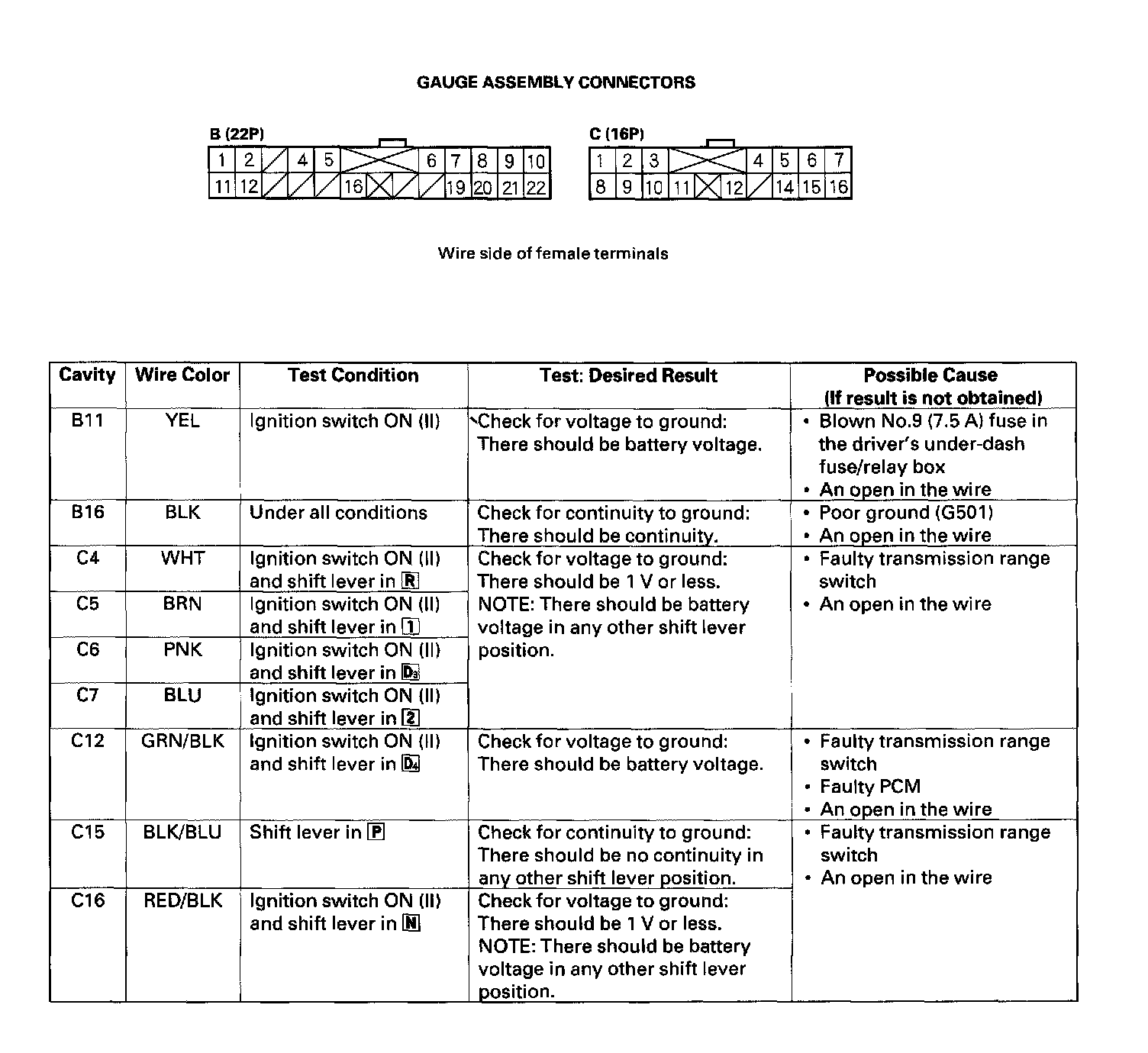 - If the terminals look OK, make the following input tests at the gauge assembly B (22P) and C (16P) connectors.