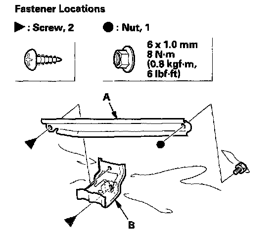 2. Remove the screws securing the pull pocket bracket (A). On power window models, remove the nut securing the center stiffener (B).