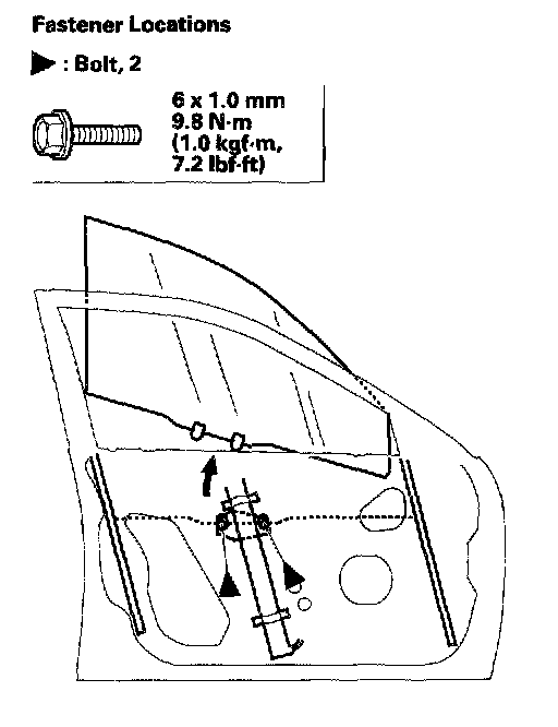 4. Carefully raise the glass until you can see the bolts, then remove them. Carefully pull the glass out through the window slot. Take care not to drop the glass inside the door.