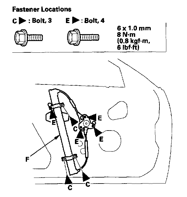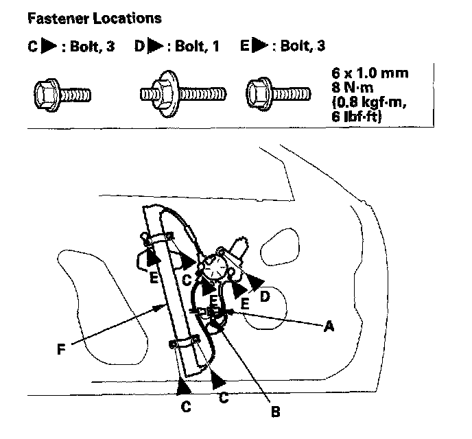 5. Disconnect and detach the connector (A) and harness clip (B) from the door (power window models). Remove the bolts (C, D) and loosen the bolts (E), then remove the regulator (F) through the hole in the door.