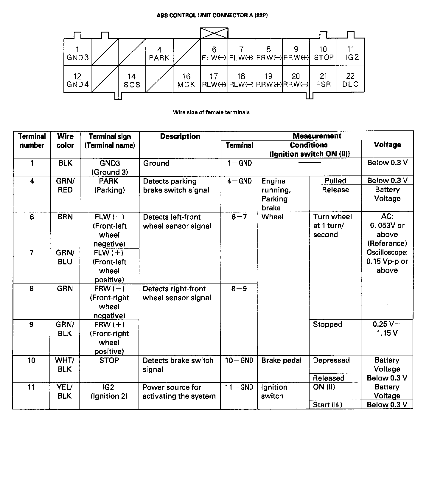 ABS Control Unit Inputs and Outputs For Connector A (22P)