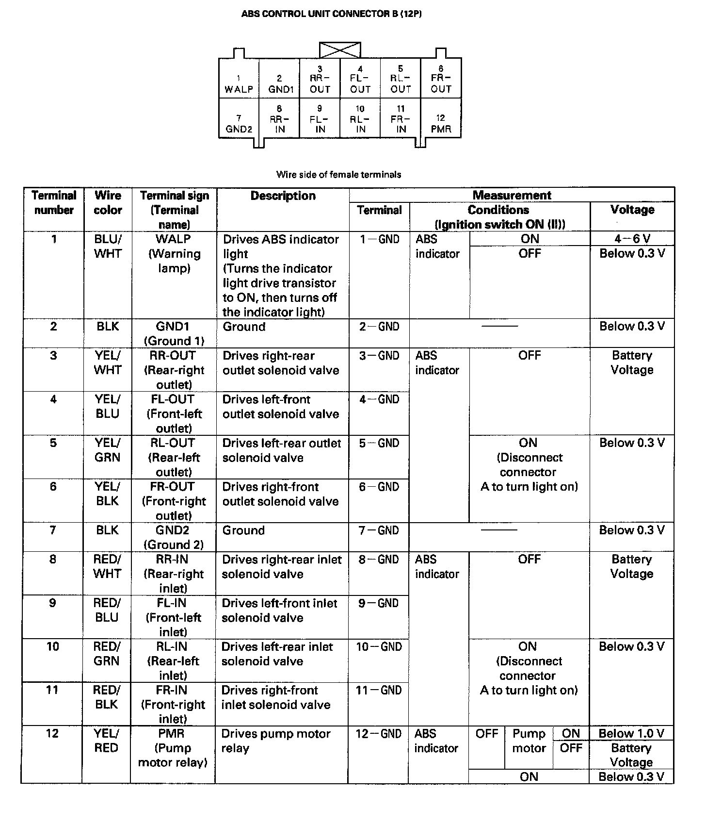ABS Control Unit Inputs and Outputs for Connector B (12P)