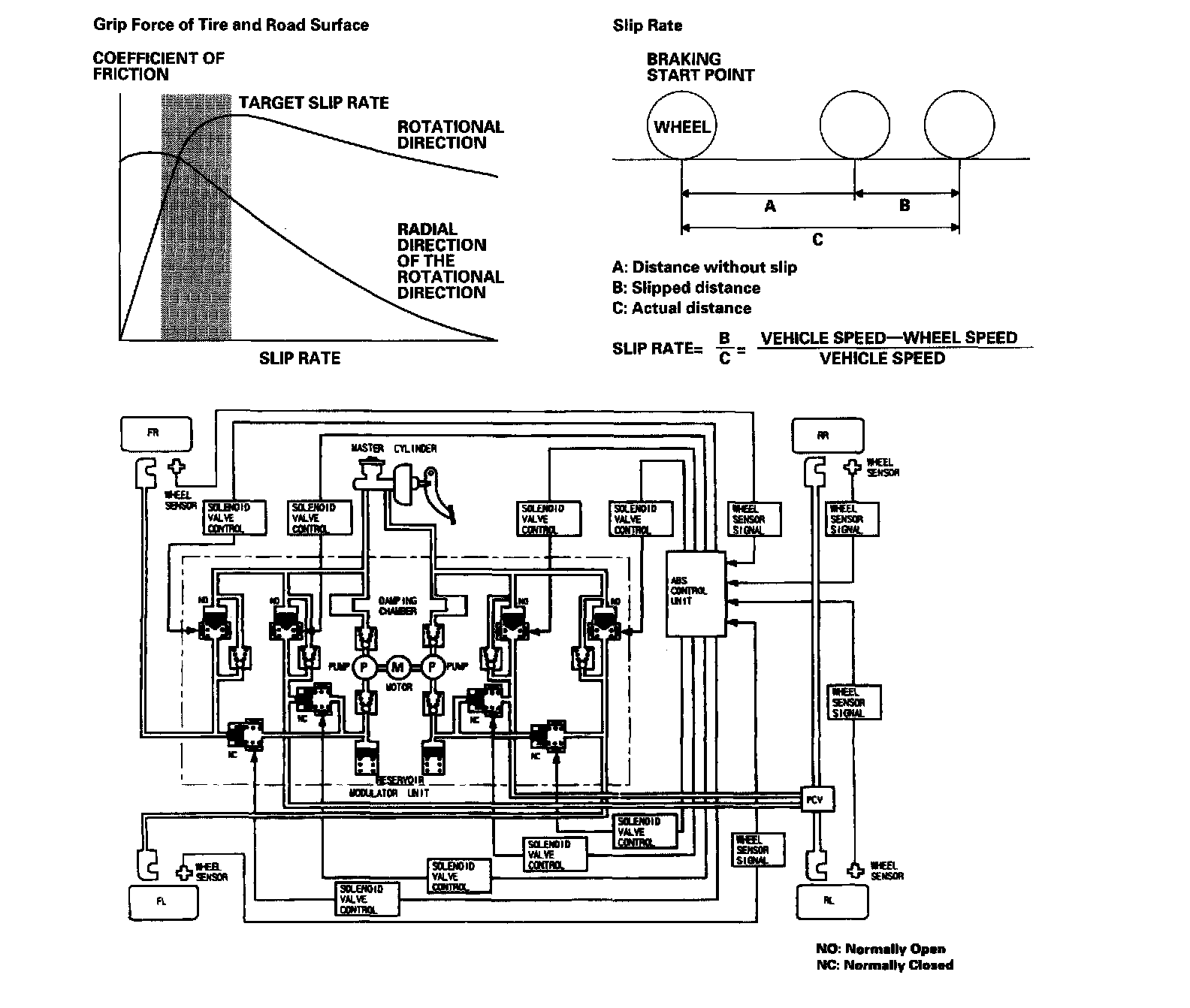 The ABS control unit calculates the slip rate of each wheel, and it transmits the control signal to the modulator unit solenoid valve when the slip rate is high.