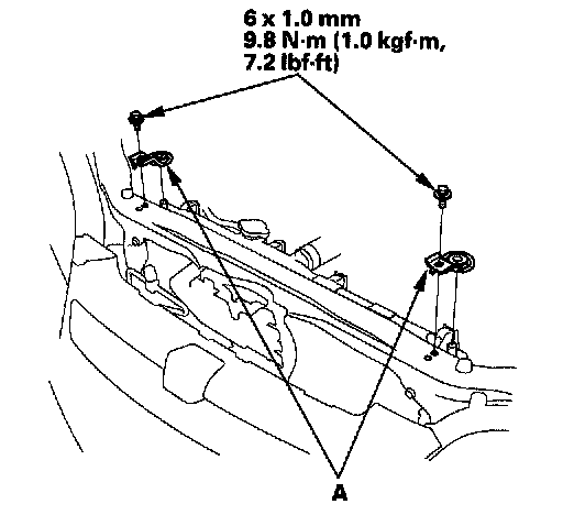 3. Remove the bolts, then remove the upper mount brackets (A) from the radiator.