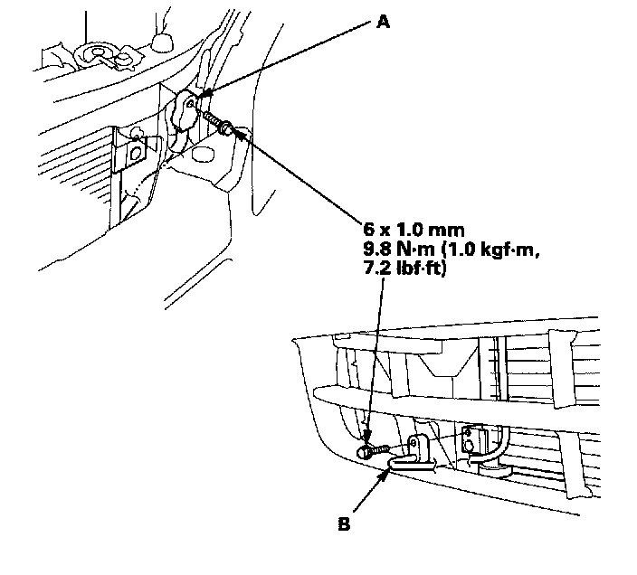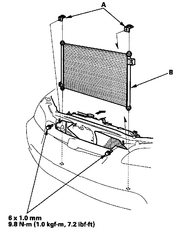 5. Remove the bolts and the upper mount brackets (A), then remove the condenser (B) by lifting it up. Be careful not to damage the radiator and condenser fins when removing the condenser.