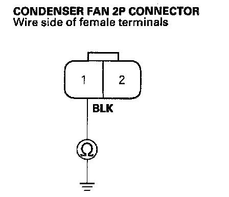 11. Check for continuity between the No.1 terminal of the condenser fan 2P connector and body ground.