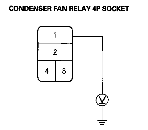 3. Measure the voltage between the No.1 terminal of the condenser fan relay 4P socket and body ground.