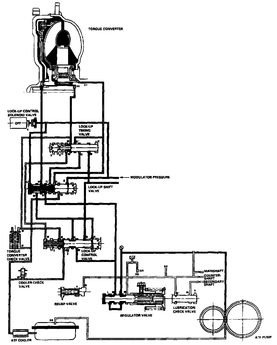 With the lock-up clutch on, fluid in the chamber between the torque converter cover and the lock-up piston is drained off, and the converter fluid exerts pressure through the piston against the torque converter cover. As a result, the converter turbine is locked to the converter cover. The effect is to bypass the converter, placing the vehicle in direct drive.