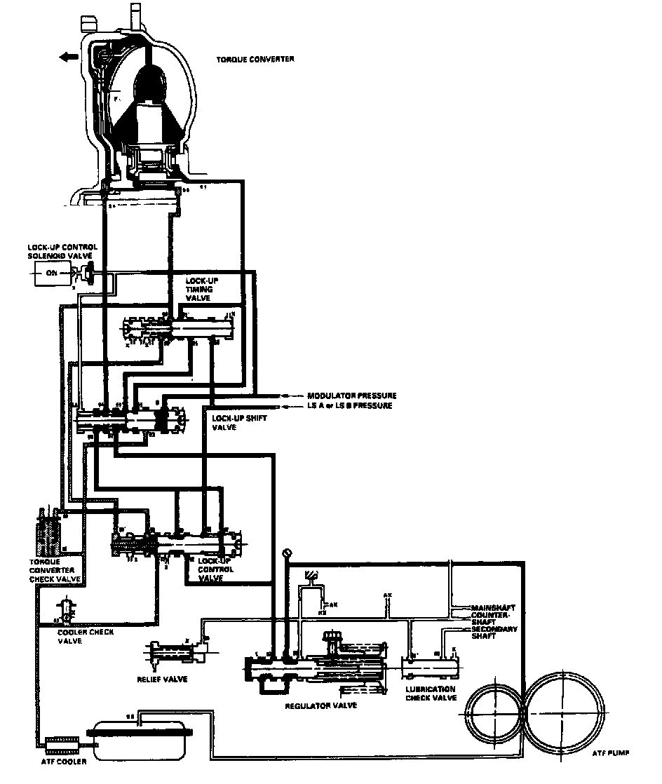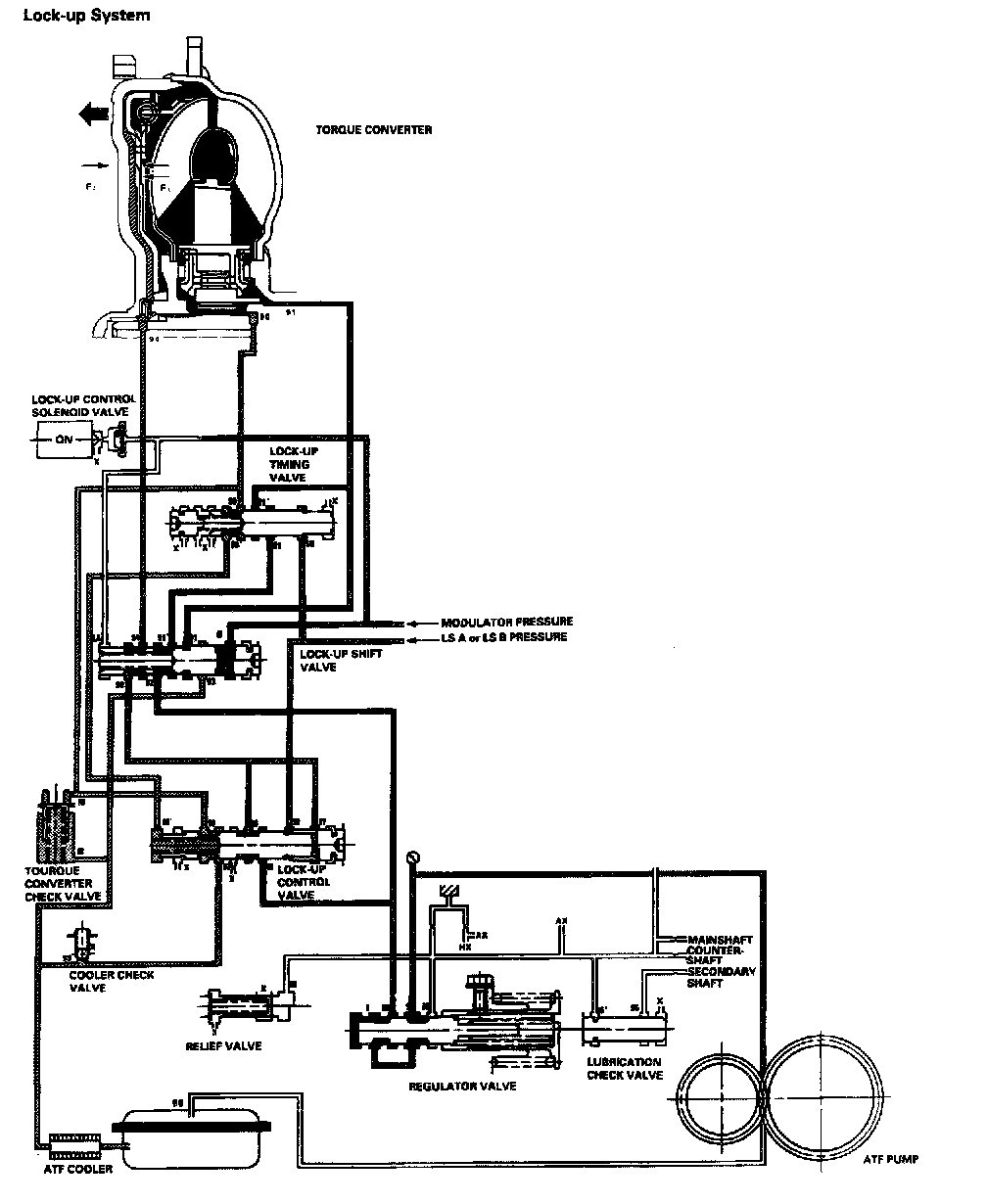 When the vehicle speed further increases, the PCM controls A/T clutch pressure control solenoid valves A and B to increase LS A or LS B pressure (58). The LS A or LS B pressure (58) is applied to the lock-up control valve and the lockup timing valve, and moves them to the left side. Under this condition, torque converter back pressure (F2) is fully released, causing the lock-up clutch to be fully engaged.