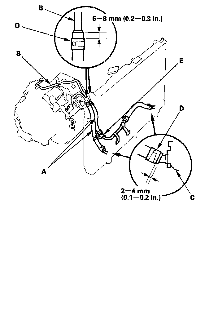Connect the cooler hoses (A) to the lines (B) and the ATF cooler (C), and secure them with the clips (D).