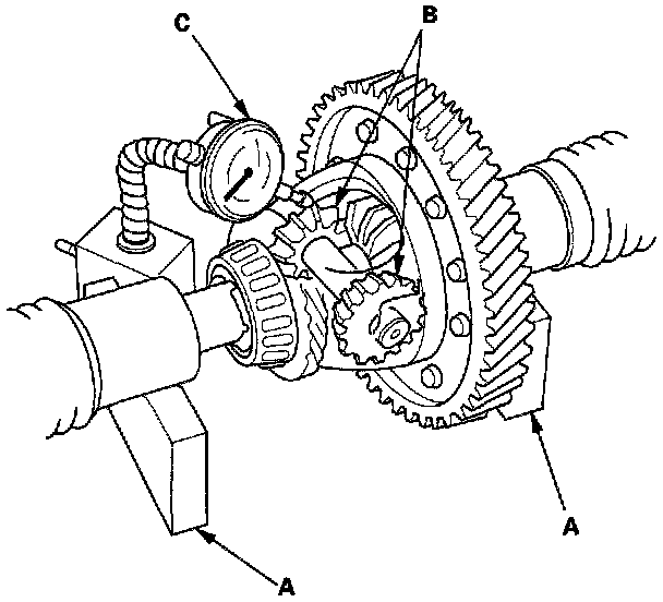 2. Measure the backlash of both pinion gears (B) with a dial indicator (C). If the backlash is not within the standard, replace the differential carrier.