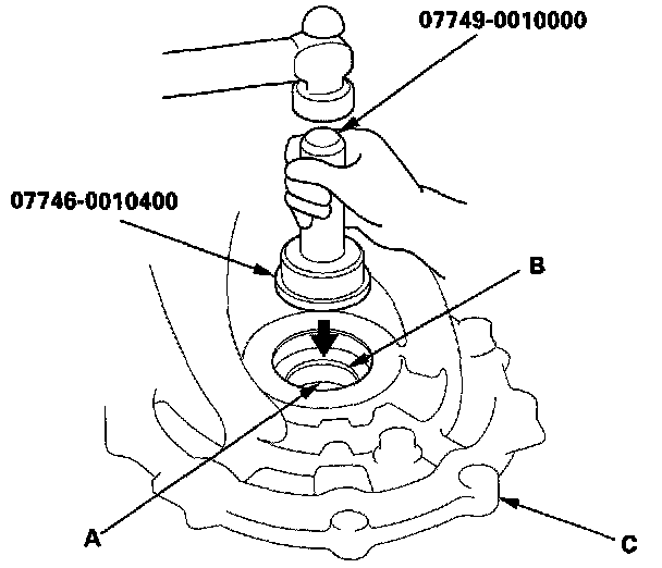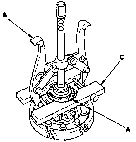 2. Remove the carrier bearing (A) with a commercially-available bearing puller (B) and bearing separator (C).