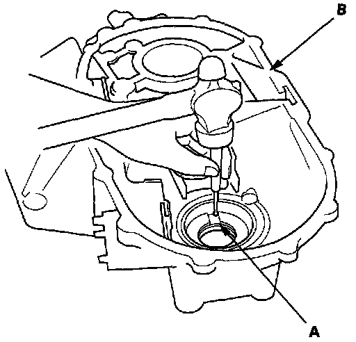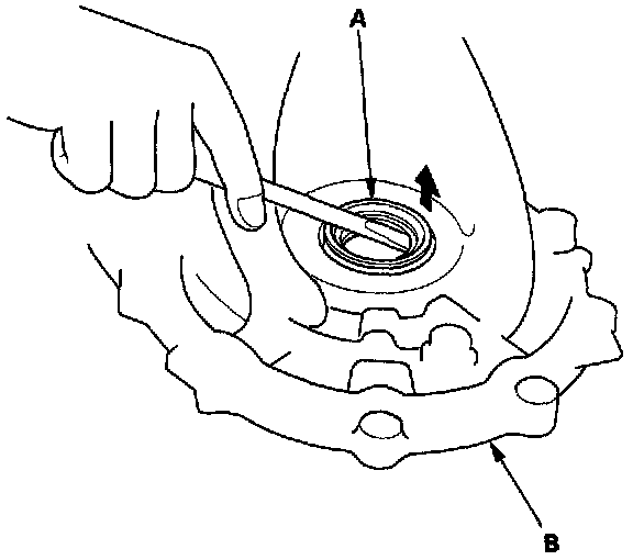 2. Remove the oil seal (A) from the transmission housing (B).