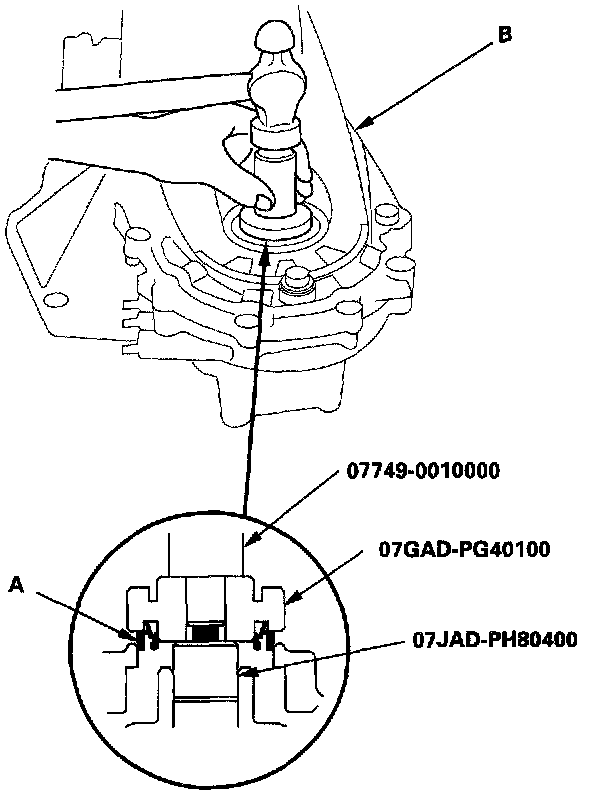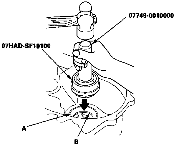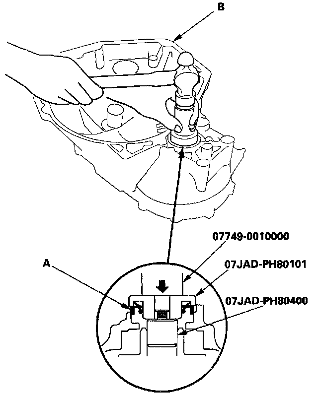 4. Install the new oil seal (A) in the transmission housing (B) with the special tools.