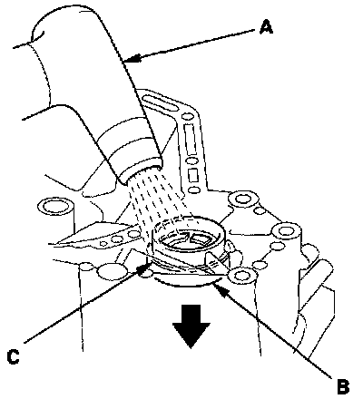 3. If you replaced the carrier bearing on the clutch housing side of the carrier, remove and discard the bearing outer race, Heat up the clutch housing to about 212°F (100°C) with a heat gun (A), then remove the outer race (B) and the 75 mm shim (C). Do not heat the housing in excess of 212°F (100°C).
