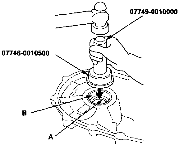 5. If you removed the bearing outer race from the clutch housing, use the special tools to install a new one (A) along with the 75 mm shim (B). There should be no space between the race, shim, and housing.