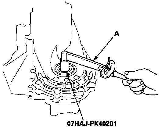 8. At normal room temperature, measure the starting torque of the differential assembly by rotating it in both directions with the special tool and a torque wrench (A).