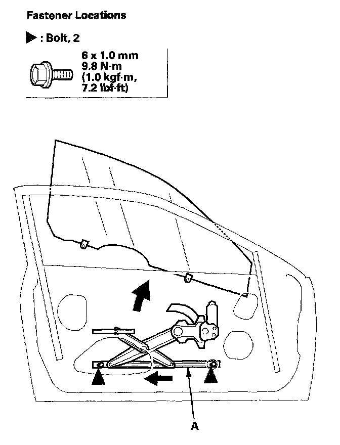 2. Carefully lower the glass until you can see the bolts, then loosen them. Slide the guide (A) to the rear, then remove the glass from the guide, and lift it out through the window slot. Take care not to drop the glass inside the door.