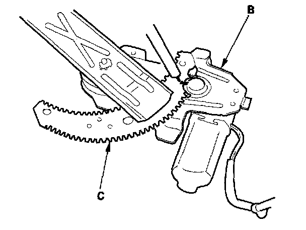 4. Scribe a line (A) across the regulator (B) and sector gear (C).