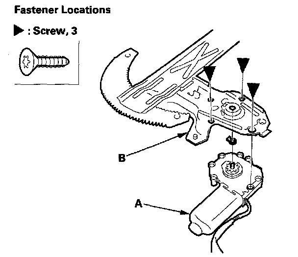 5. Using a Torx T20 bit, remove the screws, then separate the power window motor and regulator (B).