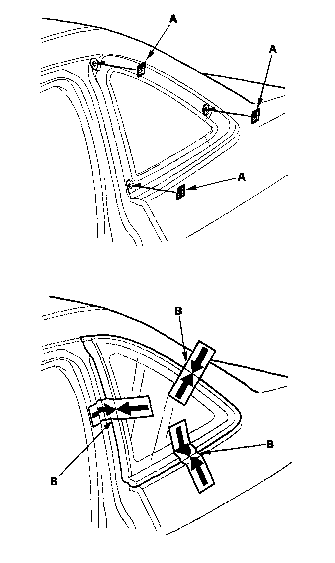 10. If the old quarter glass is to be reinstalled (and either clip is broken off the molding), seal the body holes with pieces of urethane tape (A). Then set the quarter glass upright in the opening, and make alignment marks (B) across the quarter glass and body with a grease pencil at the three points shown. Be careful not to touch the quarter glass where adhesive will be applied.