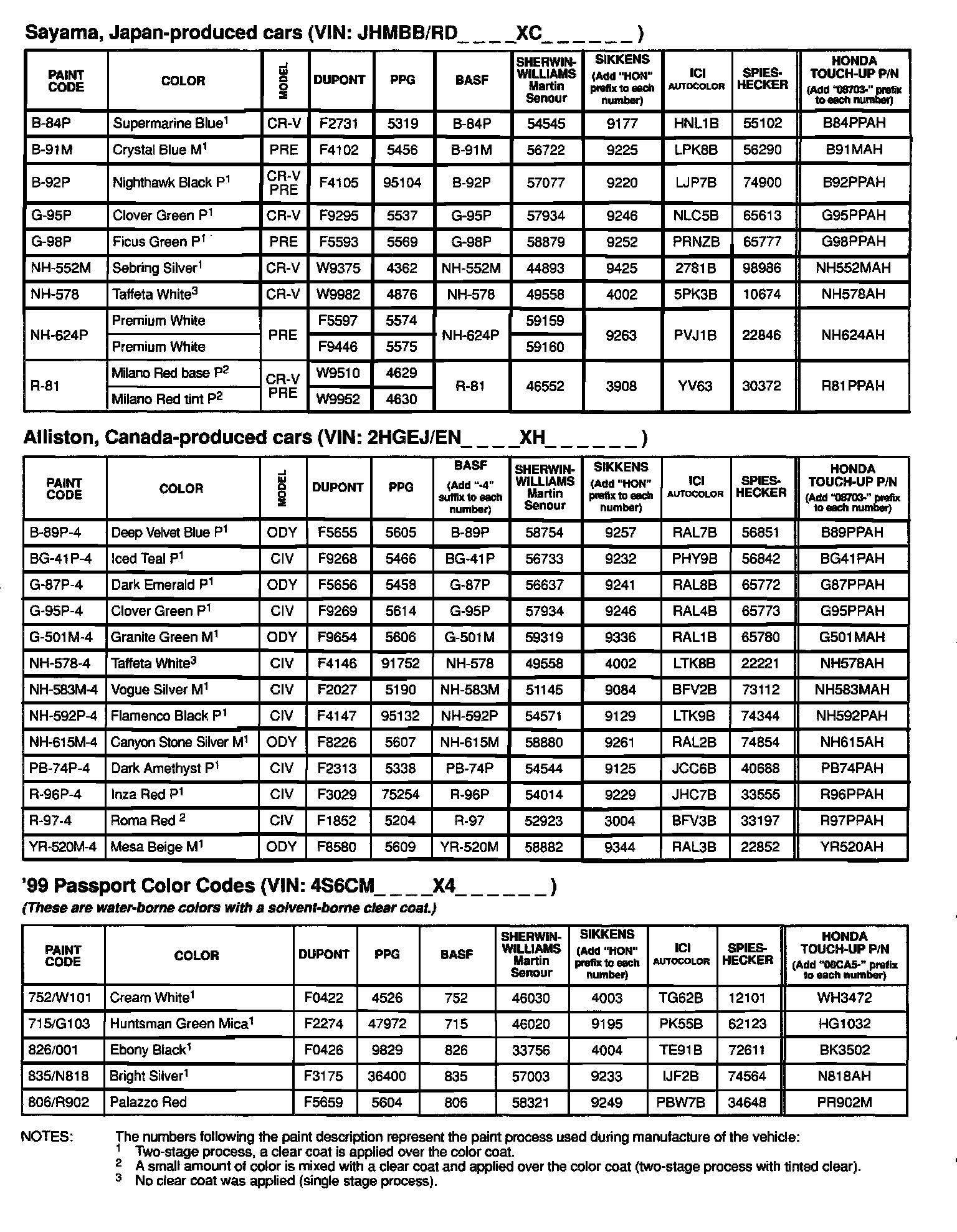 Paint formulations are determined by each paint company.For questions about formulas or matching, contact your local paint company's nearest regional office. American Honda does not endorse any paint company or type of paint; this information is provided for reference only.