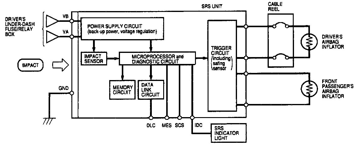 The main circuit in the SRS unit senses and judges the force of impact and, if necessary, ignites the inflator charges. If battery voltage is too low or power is disconnected due to the impact, the voltage regulator and the back-up power circuit respectively will keep voltage at a constant level.