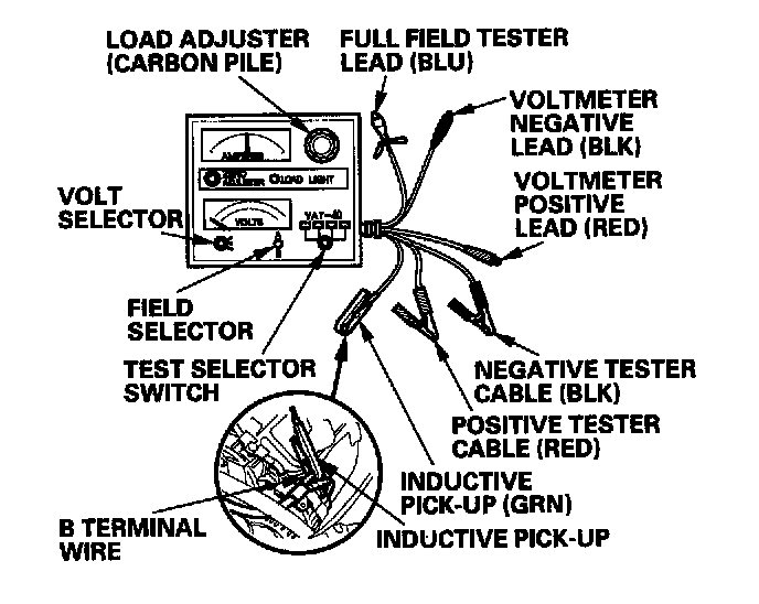 11. With the engine speed still at 2,000 rpm, full-field the alternator Attach the probe to the VAT-40 full-field test lead, and insert the probe into the full field access hold at the back of the alternator. Switch the field selector to the "A (Ground)" position momentarily, and check the amperage reading. Because voltage will rise will rise quickly when the alternator is full-fielded, do not allow the voltage to exceed 18 V: it may damage the electrical system.