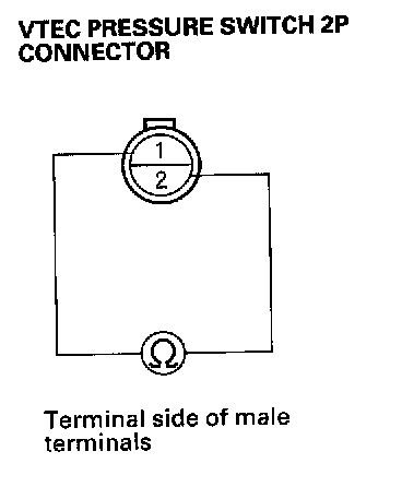 7. Check for continuity on the VTEC pressure switch between the pressure switch 2P connector terminals No.1 and No.2.