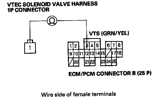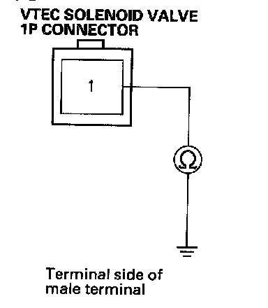 13. Check for continuity on the VTEC solenoid valve between the solenoid valve 1P connector terminal and body ground.