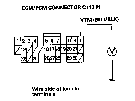 23. With the battery positive terminal still connected to the VTEC solenoid valve, measure voltage between C1O and body ground.
