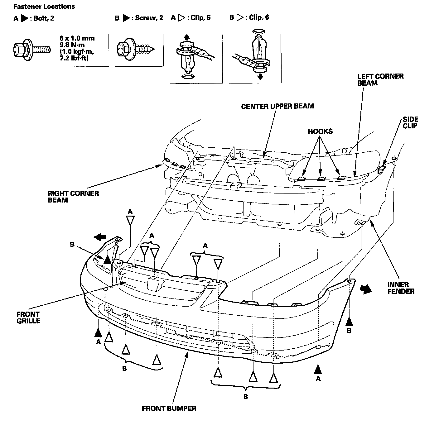 - Make sure the front bumper engages the side clips, and the hooks (of the corner upper beams) on each side securely.