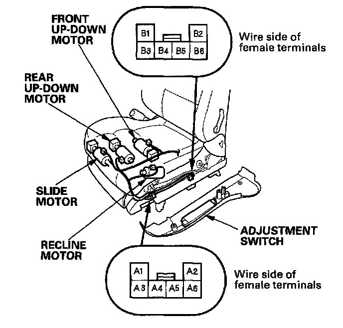 1. Remove the driver's seat.2. Disconnect the 6P connectors from the adjustment switch.