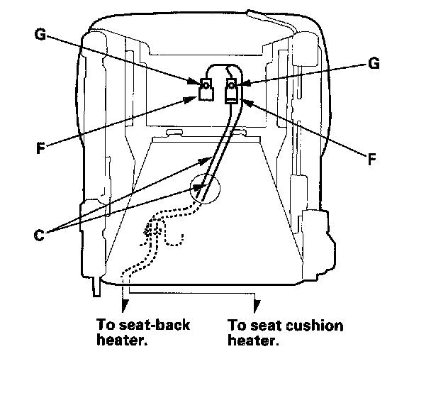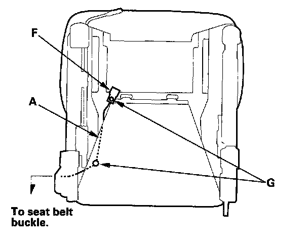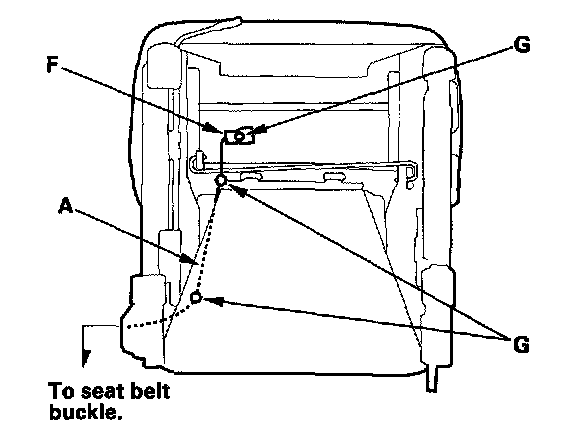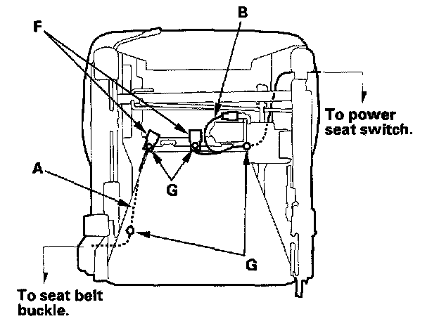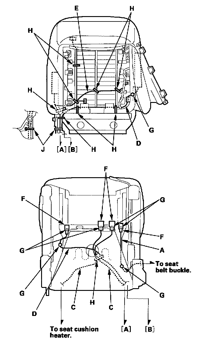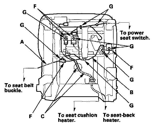 When assembling the front seat, make sure the seat belt switch harness (A), seat harness (B), seat heater harnesses (C), side airbag harness ('00 model) (D), OPDS unit harness ('00 model) (E), connectors (F), clips (G) and wire ties (H) are fastened correctly.