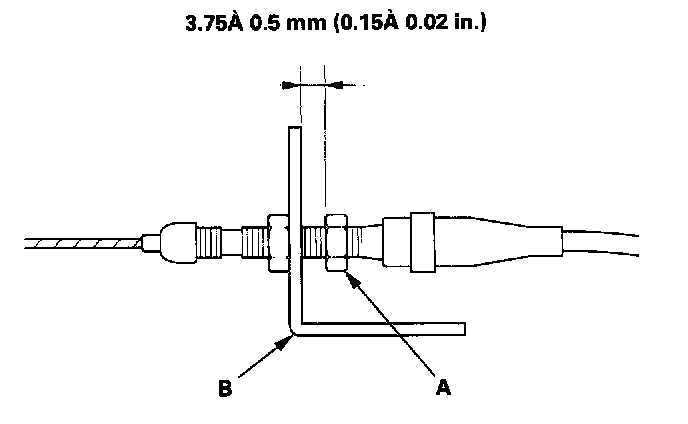 5. Turn the adjusting nut (A) until it is 3.75 ± 0.5 mm (0.15 ± 0.02 in.) away from the bracket (B).