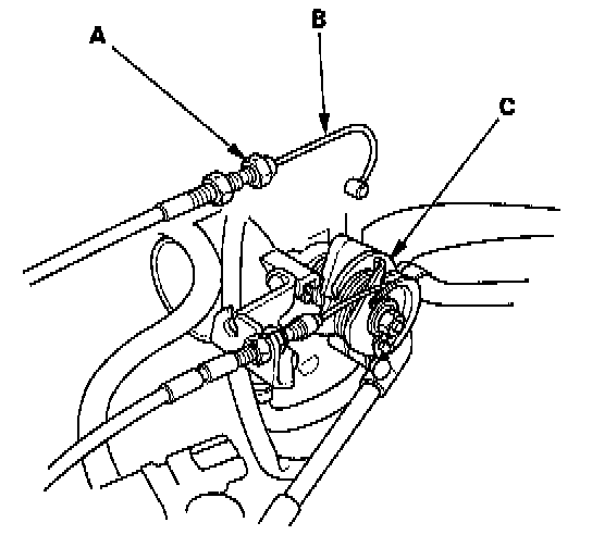 6. Loosen the locknut (A), then disconnect the actuator cable (B) from the throttle linkage (C).