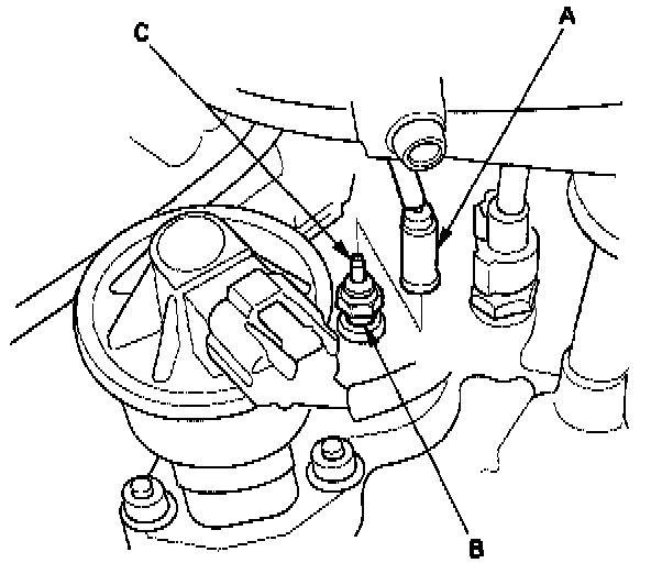 2. Using an ohmmeter, measure the change in resistance between the positive terminal (C) and the engine (ground) with the engine cold and with the engine at operating temperature.