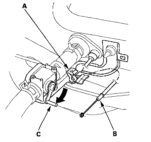 3. From under the hood, open the cable clamp (A), then disconnect the heater valve cable (B) from the heater valve arm (C). Turn the heater valve arm to the fully opened position as shown.