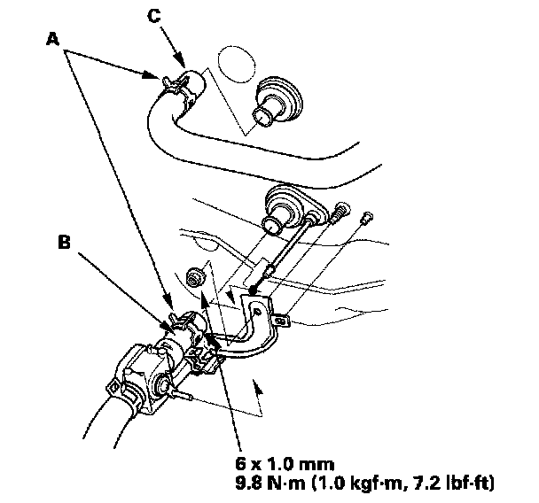 5. Remove the heater valve mounting nut. Slide the hose clamps (A) back, then disconnect the inlet (B) and outlet (C) heater hoses from the heater unit. Engine coolant will run out when the hoses are disconnected; drain it into a clean drip pan. Be sure not to let coolant spill on electrical parts or painted surfaces. If any coolant spills, rinse it off immediately.