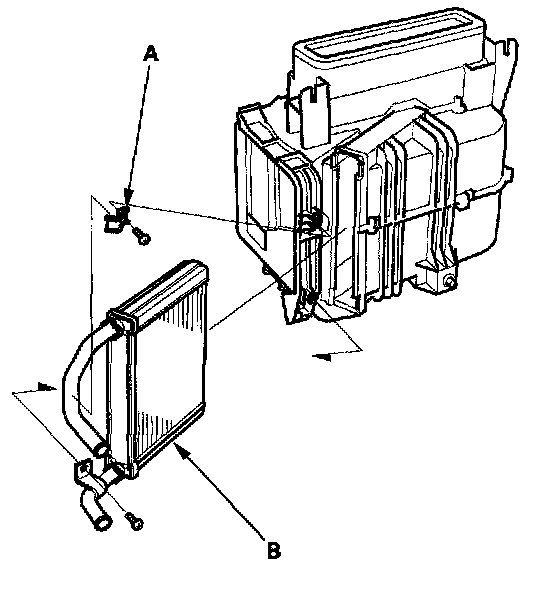 10. Remove the self-tapping screws and the bracket (A). Be careful not to bend the inlet and outlet pipes during heater core (B) removal, and pull out the heater core.