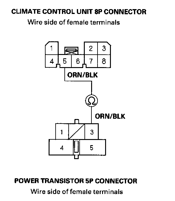 9. Check for continuity between the No.5 terminal of the climate control unit 8P connector and the No.3 terminal of the power transistor 5P connector.
