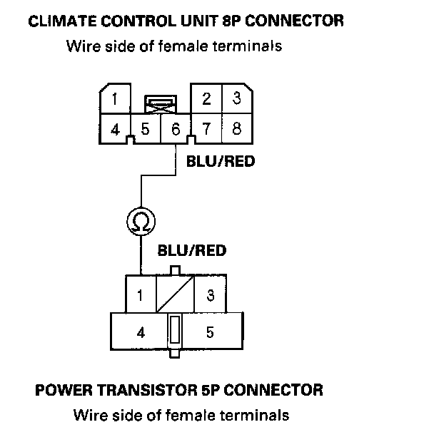 11. Check for continuity between the No.6 terminal of the climate control unit 8P connector and the No.1 terminal of the power transistor 5P connector.