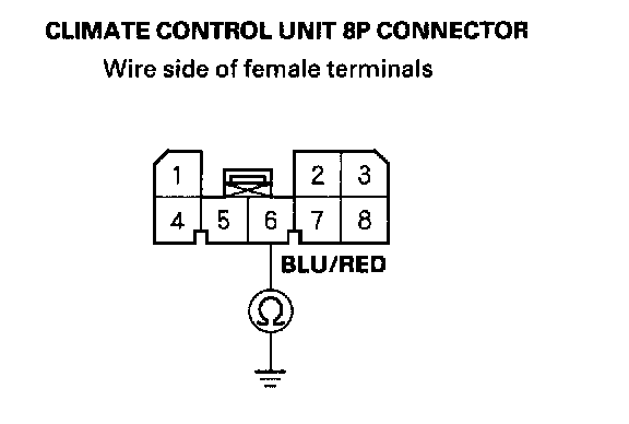 12. Check for continuity between the No.6 terminal of the climate control unit 8P connector and body ground.